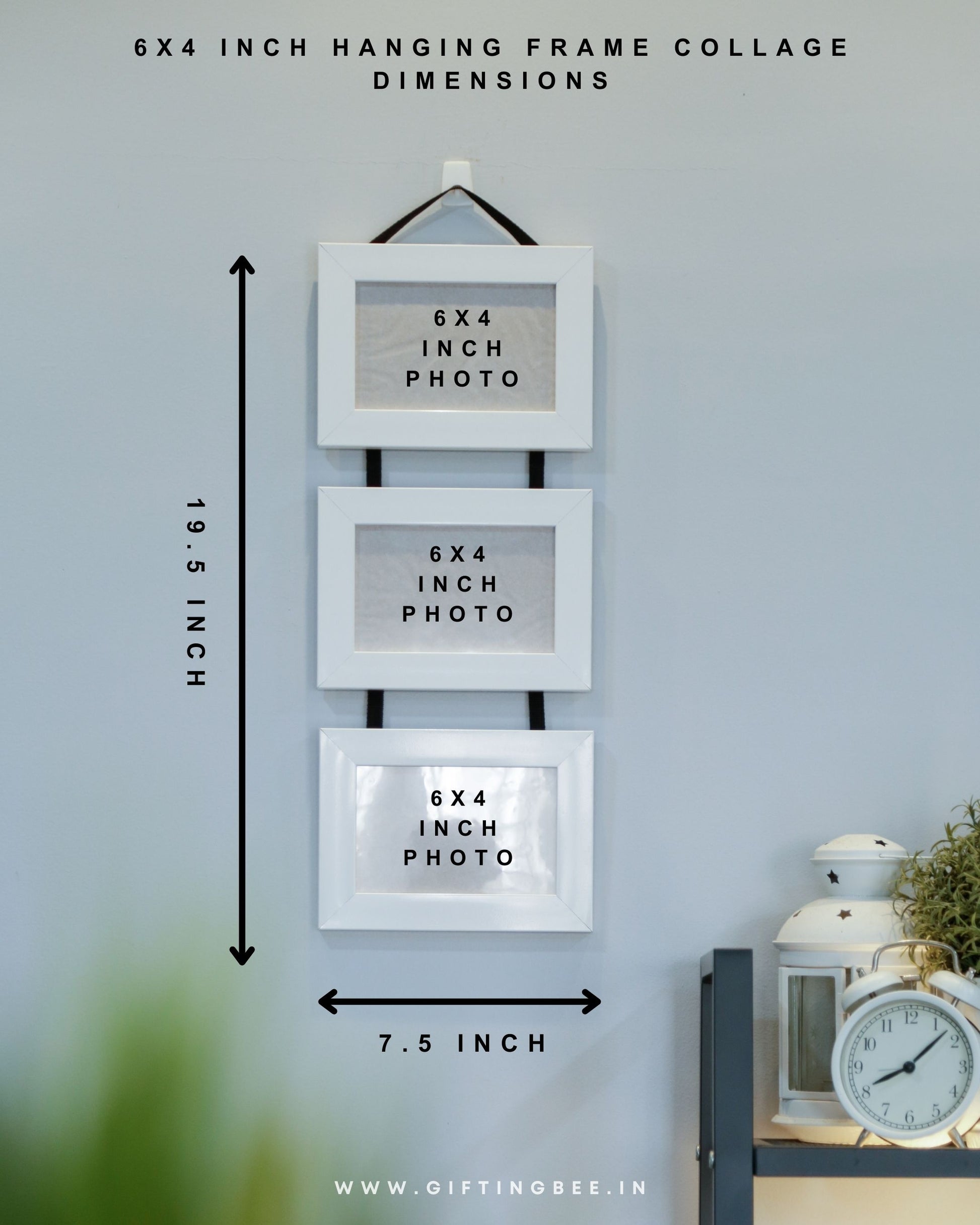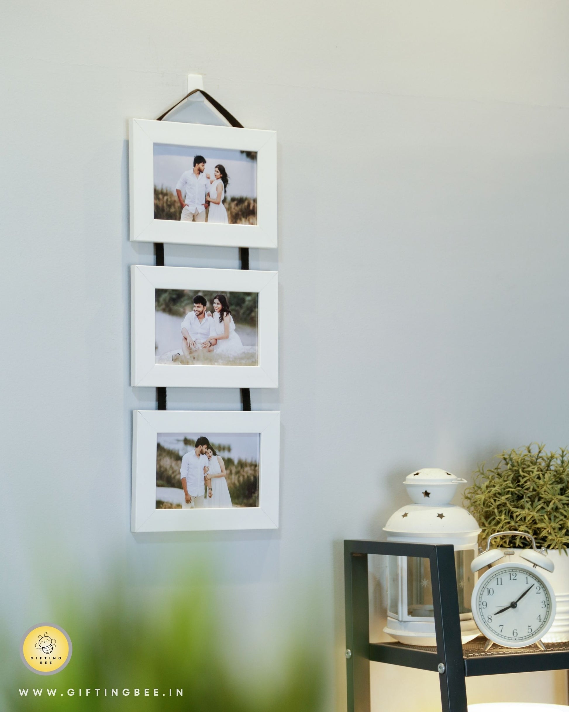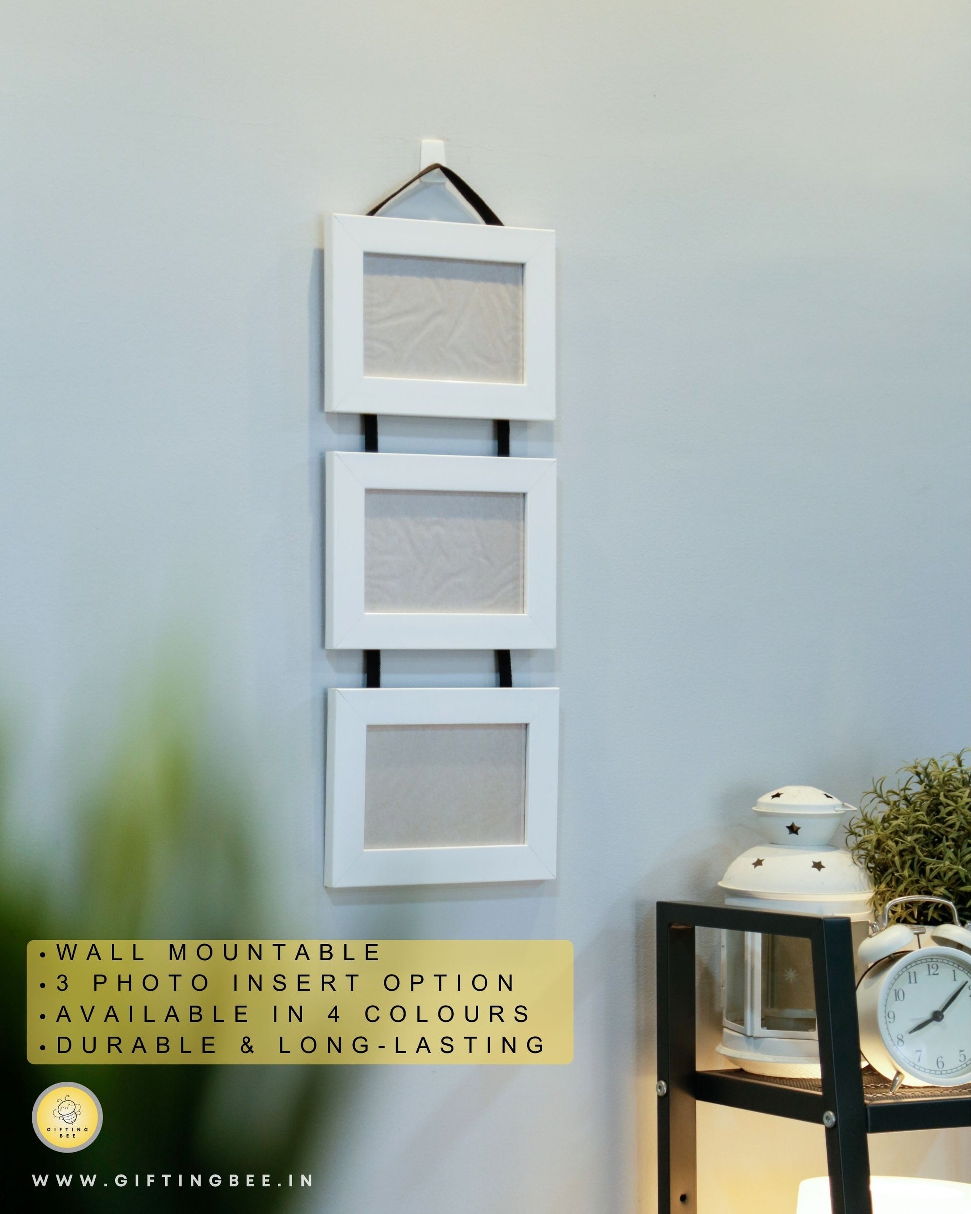 Elevate your home décor with Gifting Bee's captivating Hanging Frame Collage. This enchanting piece features three vertically aligned photo insert frames, inviting you to display your most cherished memories in a unique and stylish manner.