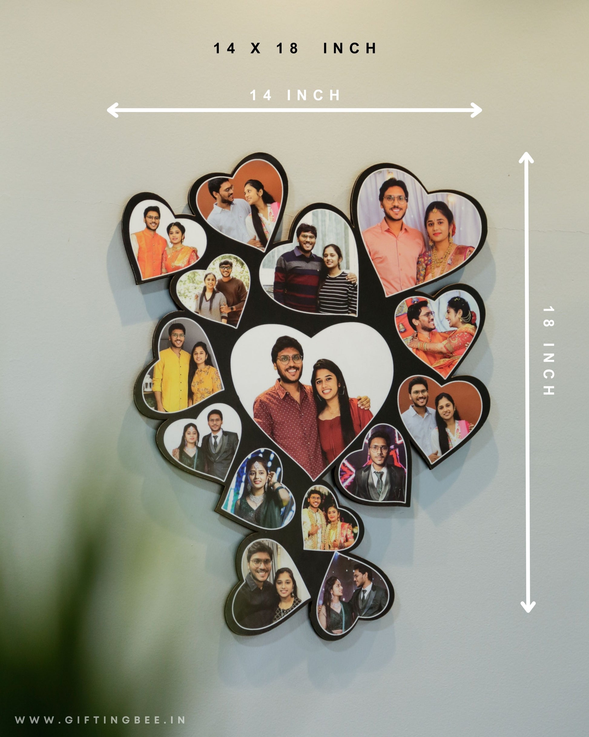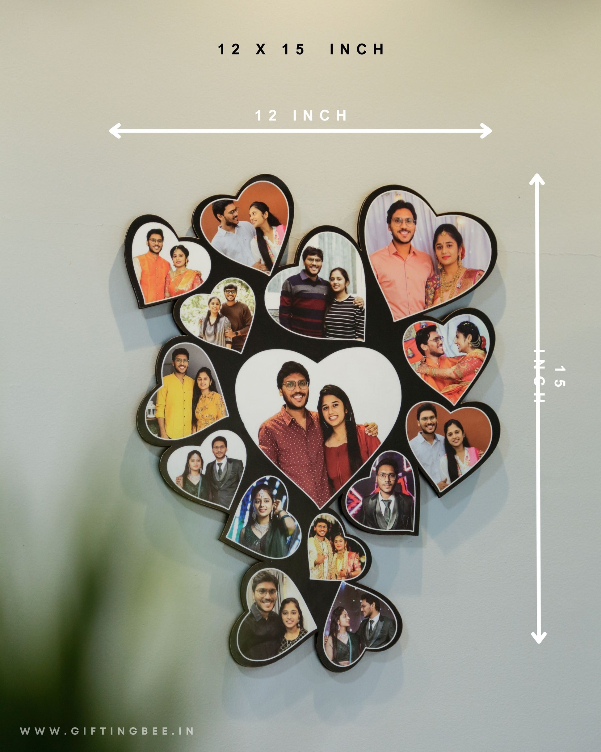 Celebrate precious memories in a stunning display of affection. This beautiful frame allows you to personalize with 15 of your favorite photos, each artfully arranged within charming heart shapes.