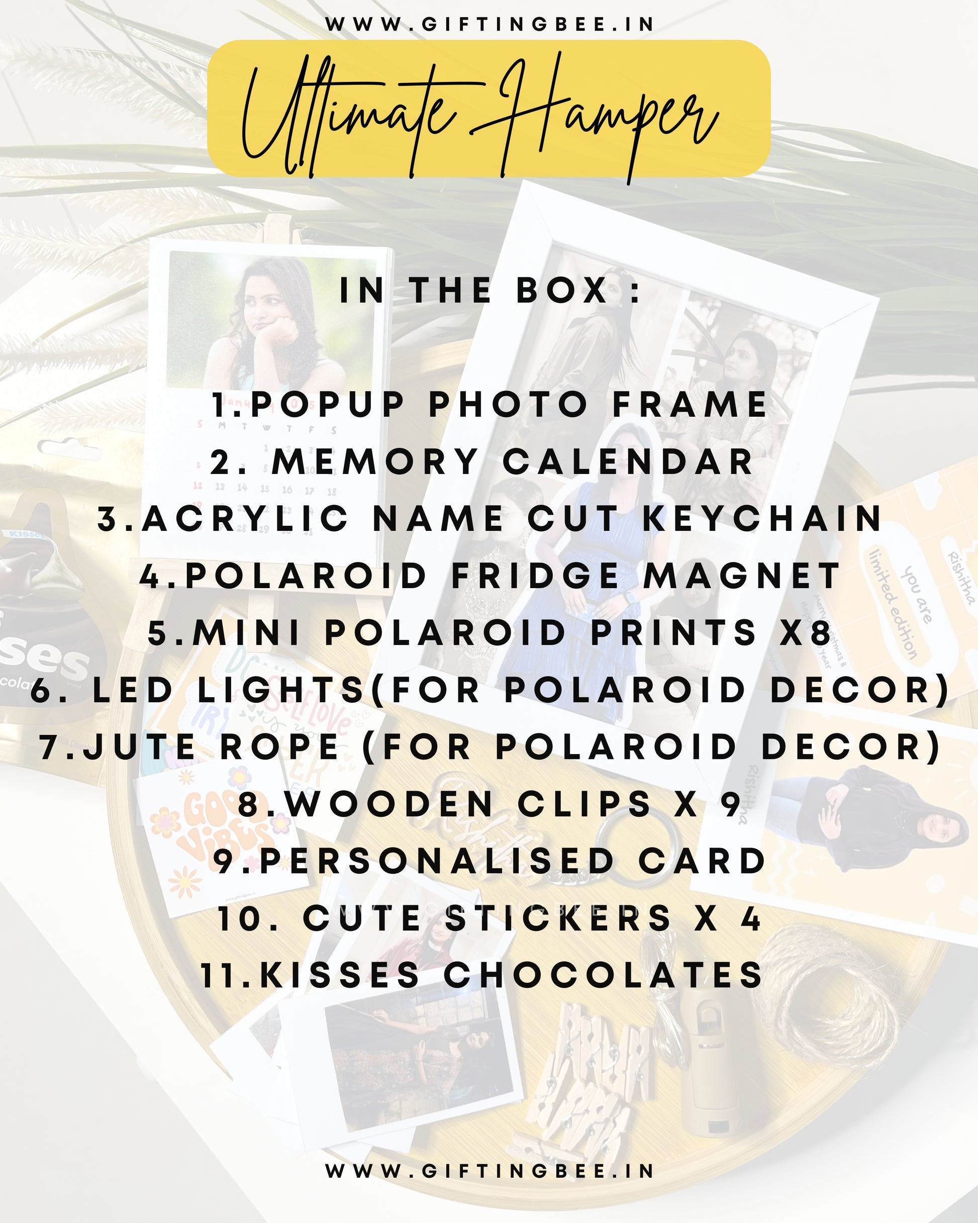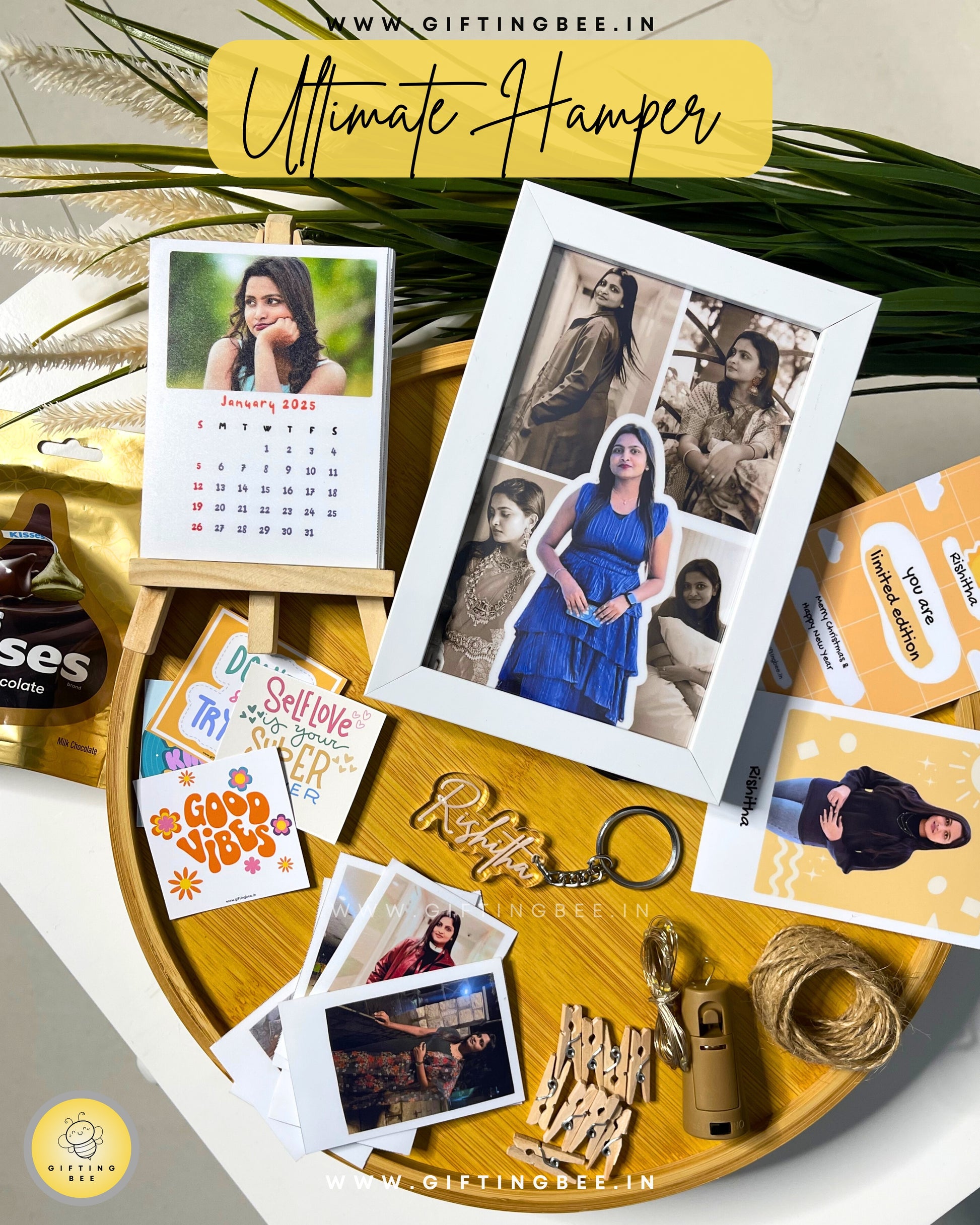 Packed with personalised goodies like a pop-out frame, memory calendar, and adorable mini polaroids, it’s designed to light up every heart. From charming decor essentials like LED lights, wooden clips, and jute rope to sweet delights like chocolates and cute stickers, this hamper adds a magical touch to every moment. Whatsapp Photos to 8333820033 for customisation.
